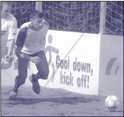 Cool down, kick off! ist eine Gemeinschaftsinitiative der Aktion Mensch und der Postbank in Zusammenarbeit mit sozialen Einrichtung, Sport- und Jugendverbänden vor Ort. Bundesweit werden jährlich in 10 Städten Straßenfußballturniere mit besonderen Spielregeln veranstaltet. Ein Rahmenprogramm und die Einladung prominenter Fußballer und lokaler Politiker ergänzen das Turnier. Zielgruppe sind jugendliche Mädchen und Jungen aus sog. sozialen Brennpunkten. Ziel ist es, die dortige Arbeit zur Konfliktlösung und Steigerung der Toleranz mit einer jugendansprechenden Aktion zu unterstützen. Neben dem Spaß beim Spiel beinhaltet das Konzept u.a. das Einarbeiten von Jugendlichen in die Methode Straßenfußball für Toleranz. Der Fußballnachmittag von Aktion Mensch und Postbank soll Kick-Off-Event für weitere, vor Ort eigenständig initiierte, Turniere sein. |